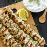 Super flavorful greek chicken kabobs marinated in zesty lemon juice, garlic and fresh herbs and served with homemade tzatziki dipping sauce!